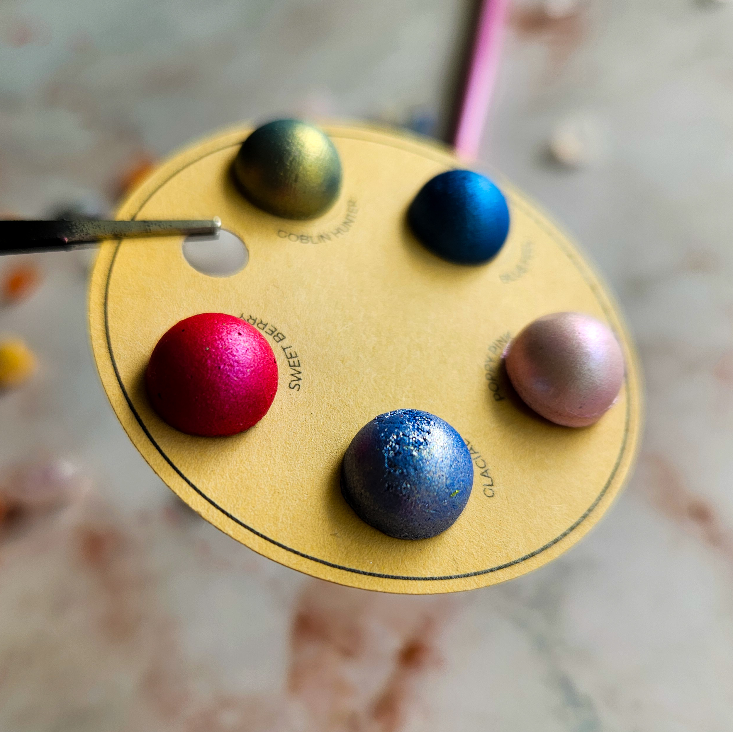 Zestaw pięciu metalicznych kolorów umieszczony na uroczej kartonowej podstawce przypominającej miniaturową paletę malarską.
