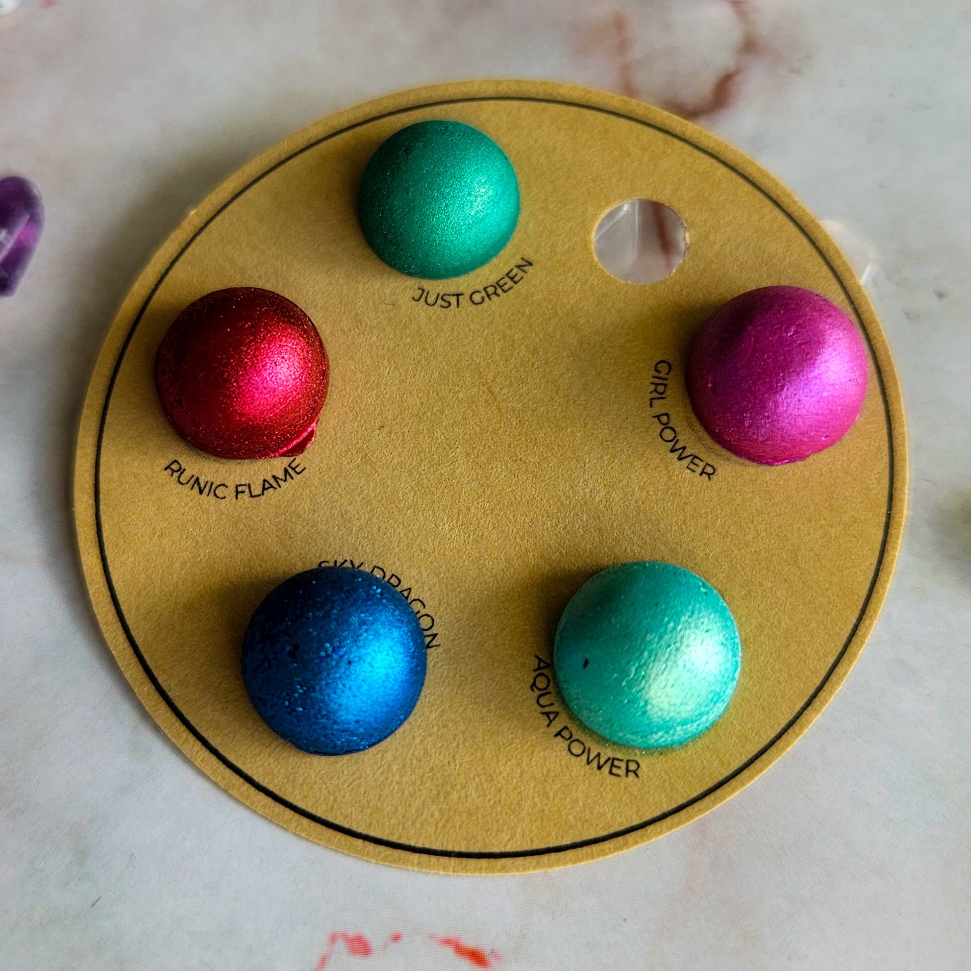 Zestaw pięciu metalicznych kolorów umieszczony na uroczej kartonowej podstawce przypominającej miniaturową paletę malarską.