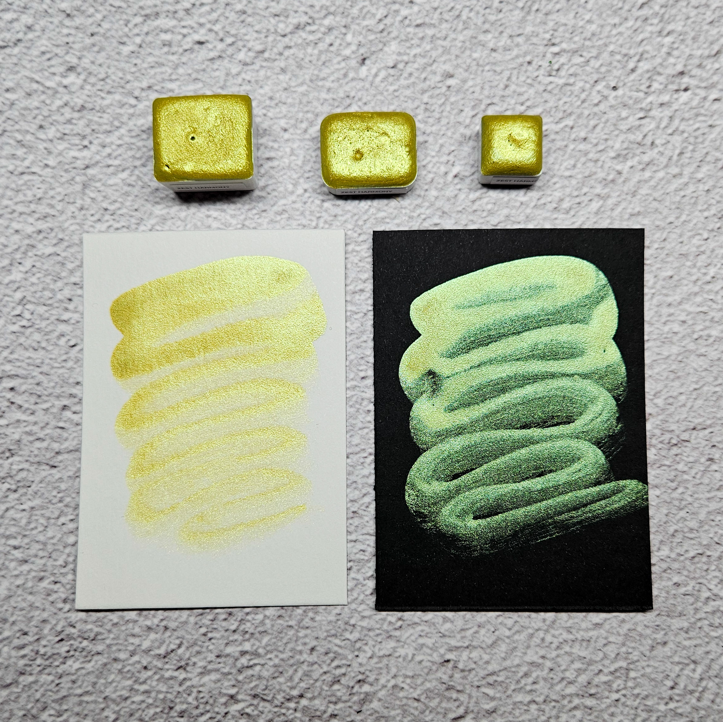 Żółta, lekko jaskrawa baza i drobinki o zmianie koloru żółty-zielony